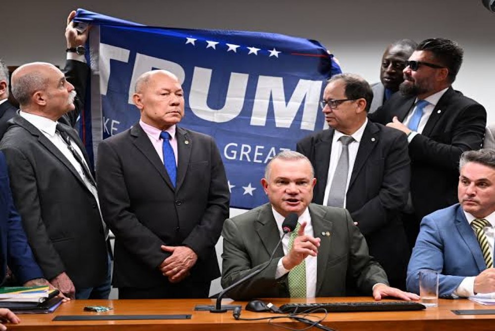 Em protesto, deputados da oposição que estavam no local para as sessões estenderam uma faixa de apoio ao presidente dos Estados Unidos, Donald Trump.